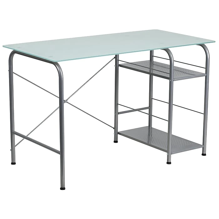 This smartly designed computer desk is an attractive work space where you can use your computer and still have plenty of room for your writing materials and desktop accessories. This computer desk features a spacious rectangular glass work surface and open storage for your CPU and other materials. A silk white tempered glass surface complements the silver powder coated frame finish. Investing in a desk for your home makes working from home or managing household bills and paperwork a nicer experience.