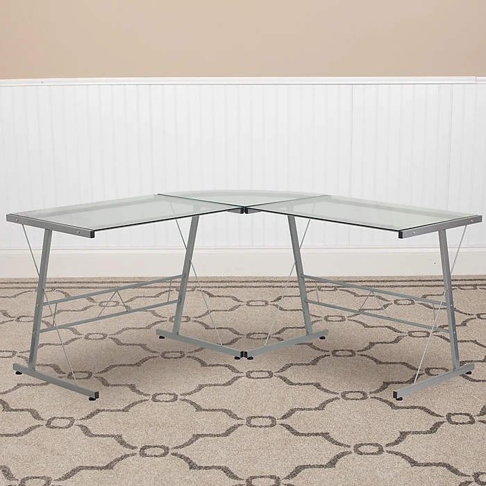 If space is not an issue for you, you should definitely invest in an l-shaped desk. The space that you have on an l-shaped unit is priceless. You will have ample space to accommodate your monitor, laptop, books, office supplies and other necessities. This contemporary computer desk has a clear, tempered glass top that sits atop an open designer frame with attractive bracing. You can place on either corner of a room or come off the wall to add an open concept feel, where you can access the desk from either side. Modernize your work area with a glass computer table that will not make your space feel closed in.