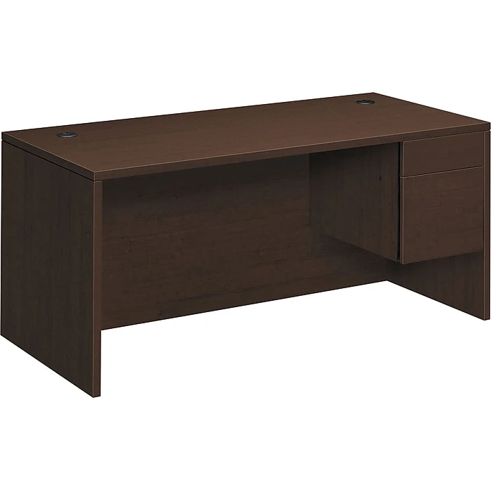- The HON 10500 Series Right Pedestal Desk offers a spacious 66-inch width, providing ample room for all your work essentials. Its laminate construction ensures durability and a sleek mocha finish complements any office decor.