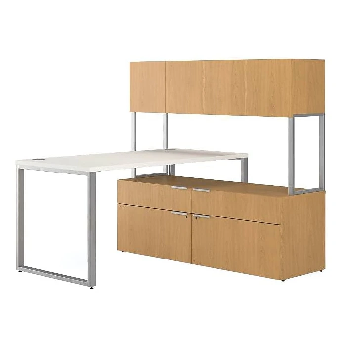 The compact L-shaped office desk by HON with a low credenza provides a great solution for home or commercial offices.