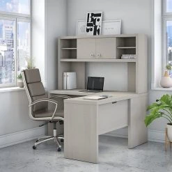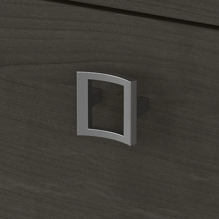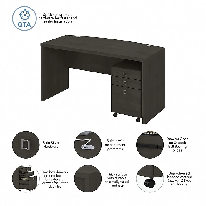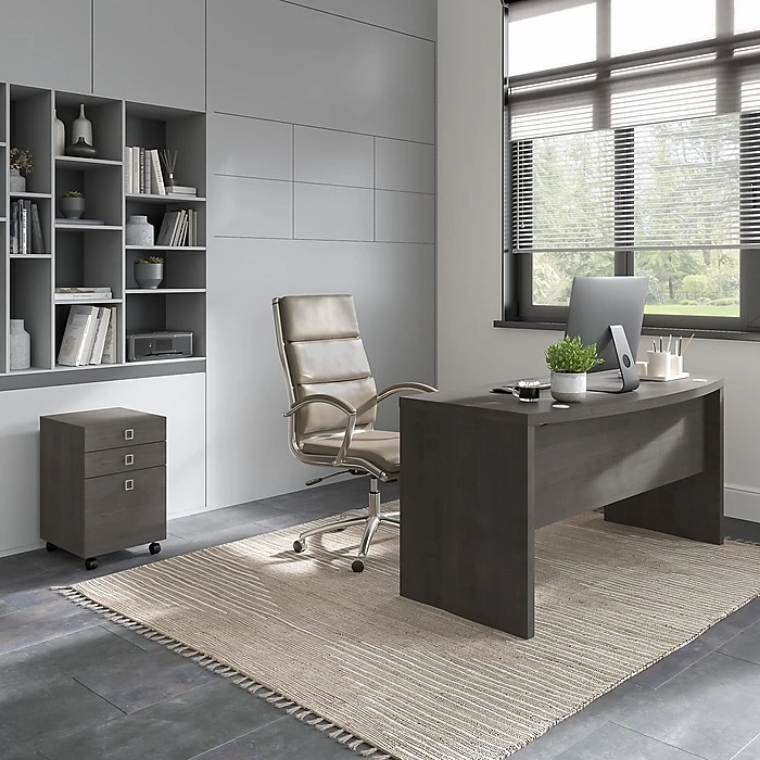 The Office by kathy ireland® Echo bow front desk with mobile file cabinet creates a strong presence perfect for those whose passion for business is only matched by their fashionable tastes. An attractive finish and appealing wide lines give a residential feel to the modern workspace. The thick thermally fused laminate surface endures years of use to maintain the office desk’s elegant style. The bow front design encourages placement in the middle of a room and offers an extended surface for guests to pull up a chair and collaborate. Organization is made easy with the mobile file cabinet, which provides two box drawers for supplies and a file drawer that opens on full-extension ball bearing slides for an easy reach to letter-size documents. Echo comes with a 3-year manufacturer warranty and meets the ANSI/BIFMA standards for safety and performance.