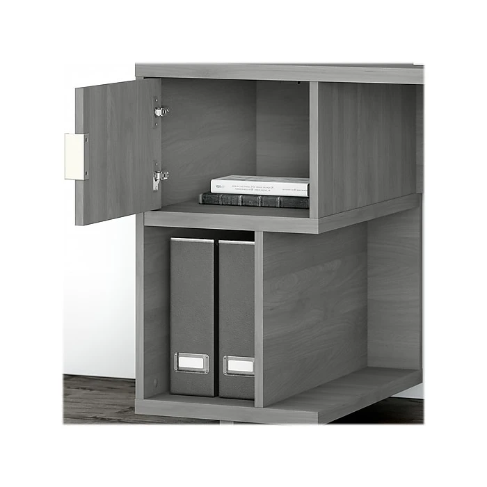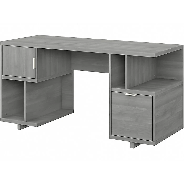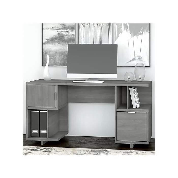 The stylish and progressive Kathy Ireland® Home by Bush Furniture Madison Avenue 59″W computer desk with drawer, storage shelves, and door offers a practical workspace with modern flair. A perfect solution for home offices, the durable 59″W x 24″D desktop provides plenty of room to spread out with a computer, paperwork, and more while supporting up to 200 lbs. The asymmetrical design includes a file drawer and a cabinet to ensure that the materials you need are always within reach. Two vertical cubby spaces organize books and binders while open shelving offers additional storage space. The computer desk is finished on all sides to look great facing any direction. Find the perfect style for your work or living space with three finish options. This home office desk with storage is tested to meet ANSI/SOHO quality standards for safety and performance and is backed by a 3-year warranty.