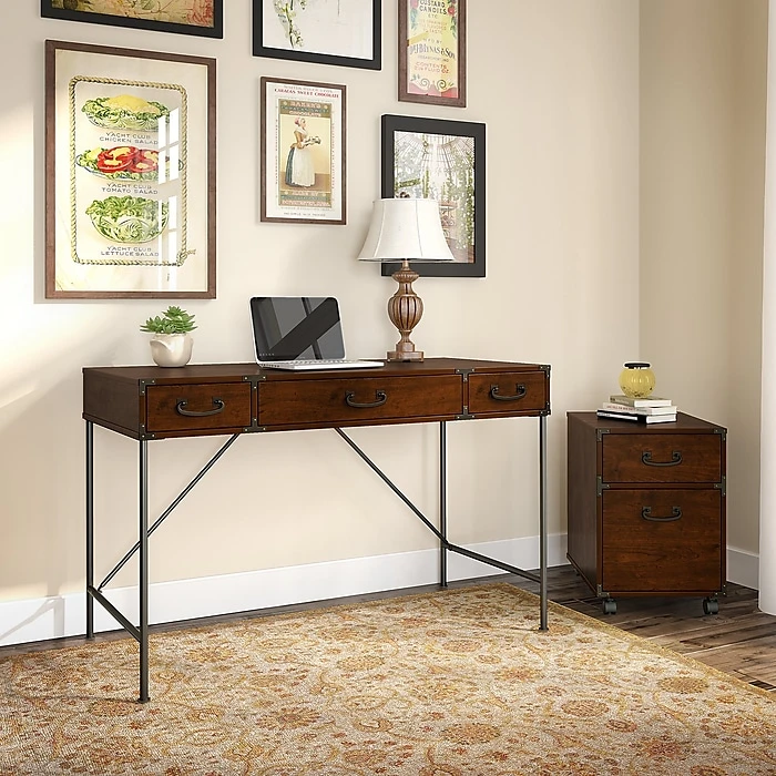 Capture a sense of heritage with the kathy ireland® Home by Bush Furniture Ironworks 48W Writing Desk and 2 Drawer Mobile Pedestal. Desk features a durable laminate work surface with exposed structural steel legs, Aged Bronze accents and metal pulls. Functional center drawer with a drop down front is ideal for keyboard or laptop storage and two convenient box drawers for supplies. Mobile Pedestal features casters for placement flexibility or simply store efficiently beneath the Desk. Locking casters offer secure placement for filing and safety. Full-extension ball bearing slides on file drawer accept letter and legal-sized files. Construction meets ANSI/SOHO furniture standards for strength and durability for affordable home furnishings backed by a 3 Year Manufacturer’s Warranty.