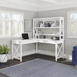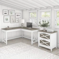 Bush Furniture Key West 60″ L-Shaped Desk – Shiplap Gray & Pure White | Laminated Wood Office Desk