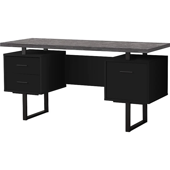 Feel like a boss in your home office when you sit down to work at this mid-size computer desk with three storage drawers. The thick-panel floating desktop provides generous room for a laptop and writing materials, while allowing you to use the tops of the drawer units as extra surfaces. Finished in a black laminate that contrasts with the gray desktop. Two small drawers and one large drawer with a bar for hanging files offer space for items you want to keep off the work surface. For flexibility, the drawer units are reversible and can be installed on either side according to your preference. Supporting the desk are metal legs in a black finish with a modern and stylish U shape.