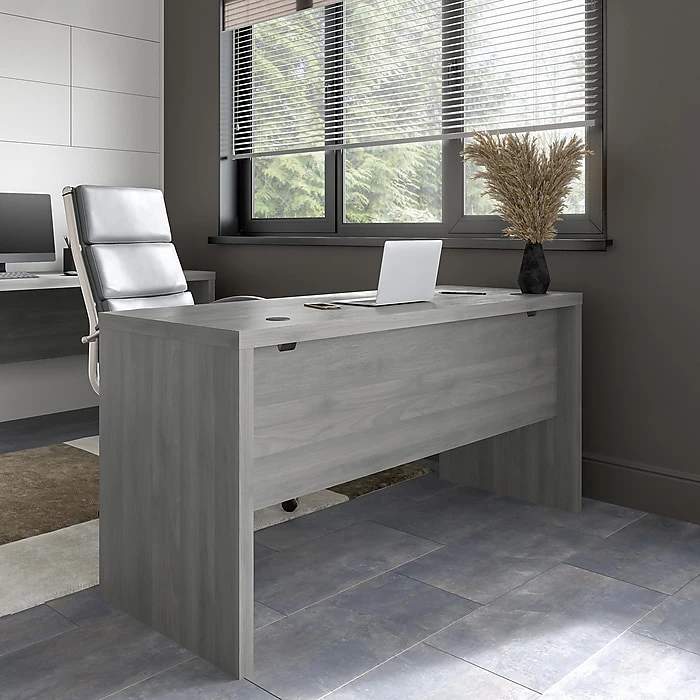 A standalone workspace or the start of something bigger, the Office by kathy ireland® Echo credenza desk offers an elegant, functional design to inspire today’s professional. Wide lines and thick surface create a strong presence, while a thermally fused laminate finish protects the office desk throughout years of daily use. Spread out on the spacious 60″W desktop with your computer, paperwork, or any other tasks of the day. Place the credenza in a corner to save floor space in compact areas, or make use of the finished back to take a prominent position in the middle of the room. Combine with an Office by kathy ireland® Echo 36″W return to form an L-shaped configuration, and add a 60″W bow front desk to form a U-shaped layout for larger environments (both sold separately). This desk comes with a 3-year manufacturer warranty and meets ANSI/BIFMA quality standards.