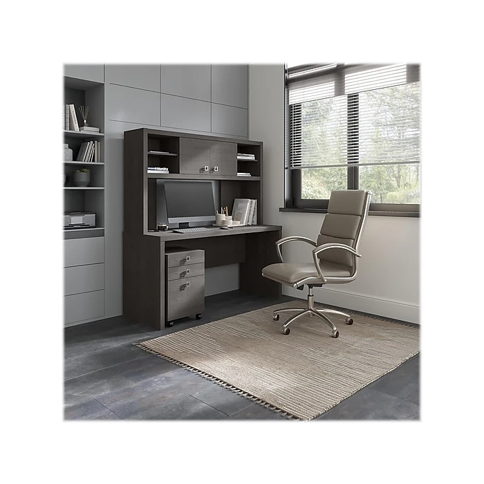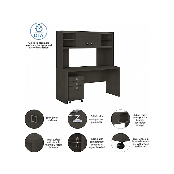 - Bundle includes: 60″W credenza desk, 60″W hutch, three-drawer mobile file cabinet