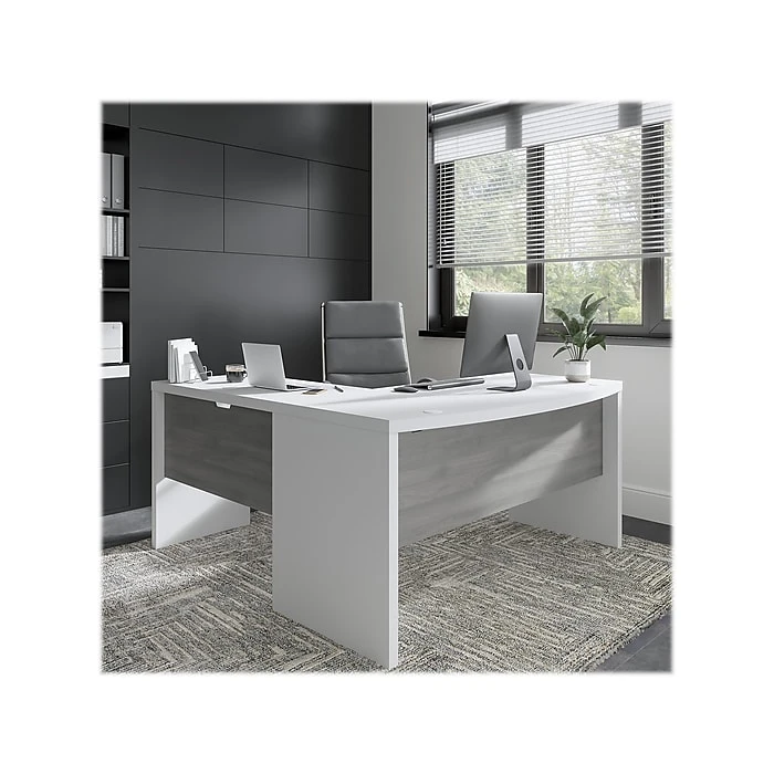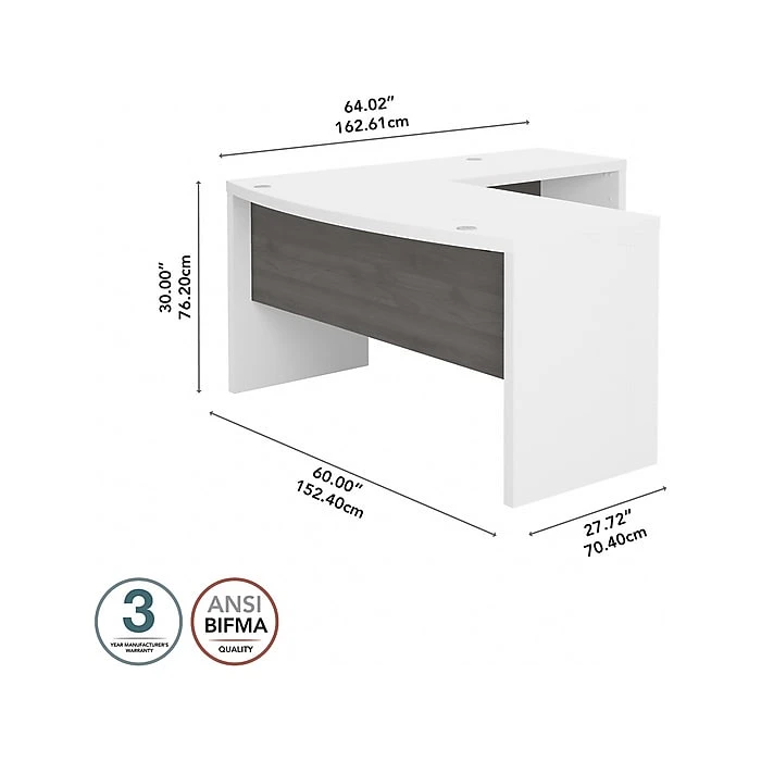 The Office by kathy ireland® Echo L-shaped bow front desk creates a strong presence perfect for those whose passion for business is only matched by their fashionable tastes. An attractive finish and appealing wide lines give a residential feel to the modern workspace. Thick and durable, the thermally fused laminate finish endures years of daily use to maintain the elegance of the office desk. Spread out on the spacious L-shaped surface with your computer, paperwork, or any other tasks of the day. The bow front design encourages placement in the middle of an office or room and provides an area for guests to pull up a chair and collaborate. Attach the return to either side of the desk to form a left- or right-handed layout. From Office by kathy ireland®, Echo comes with a 3-year warranty and meets ANSI/BIFMA standards for safety and performance.
