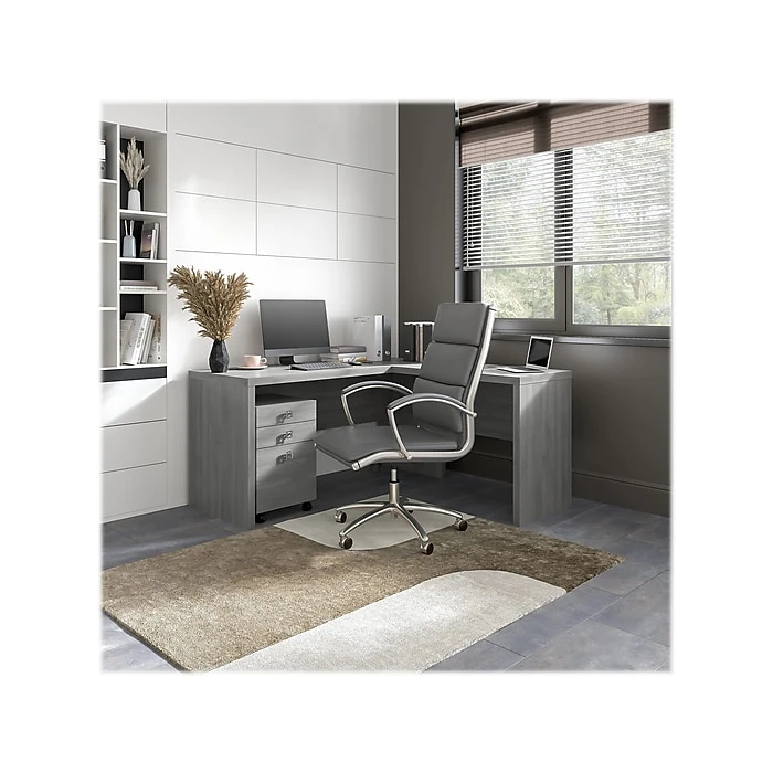 The Office by kathy ireland® Echo L-shaped desk with mobile file cabinet offers an elegant, functional design to inspire today’s professional. Wide lines and a thick surface create a strong presence, while the thermally fused laminate finish protects the office desk throughout years of use. Spread out on the spacious L-shaped desktop with your computer, paperwork, or any other tasks of the day. Attach the return to either side of the desk to form a left- or right-handed layout. Organization is made easy with the mobile file cabinet, which provides two box drawers to store office supplies and a file drawer that opens on full-extension ball bearing slides for an easy reach to letter-size documents. The file cabinet rolls effortlessly on dual-wheel casters. From Office by kathy ireland®, the bundle comes with a 3-year warranty and meets the ANSI/BIFMA standards.
