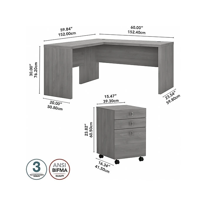- Bundle includes: 60″W credenza desk, 36″W return, three-drawer mobile file cabinet