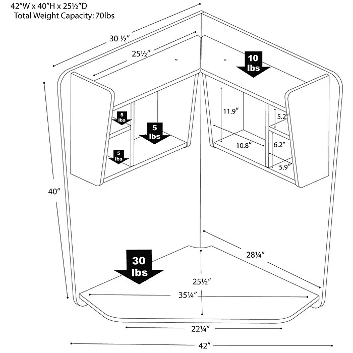 Convert any corner in your home into a mini office with the Prepac Floating Corner Desk. Cleverly designed to make assembly and installation a breeze, this desk features a large work surface for your computer and a cutout for cord management. Use the 7 top shelves for storing books, stationary and supplies.