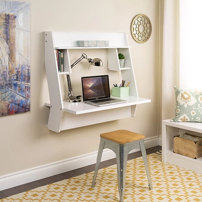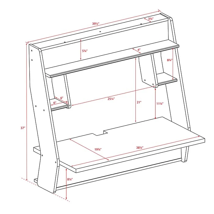 The Studio Floating Desk’s unique modern design provides a stylish workspace without taking up any of your floor space. This desk is perfectly suited for any home office, den, living room, kitchen, dorm room or kids bedroom. The stable 38.25” by 19.75” work surface provides great spot to place your computer, work on homework or read your favorite book. The side compartments provide functional storage for books and media while the top shelf is ideal for photos or your favorite knick-knacks. Installation is a breeze with Prepac’s innovative metal hanging rail system that supports the full weight of the desk plus an additional 80lbs. Manufactured in Canada from non-toxic, laminated composite woods and meets all North American safety standards. Ships ready-to-assemble, includes an instruction booklet for easy assembly and has a 5-year manufacturer’s limited warranty.