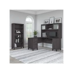 Bush Somerset 60″ L-Shaped Desk with Hutch & 5-Shelf Bookcase | Storm Gray | Laminated Wood Office Furniture
