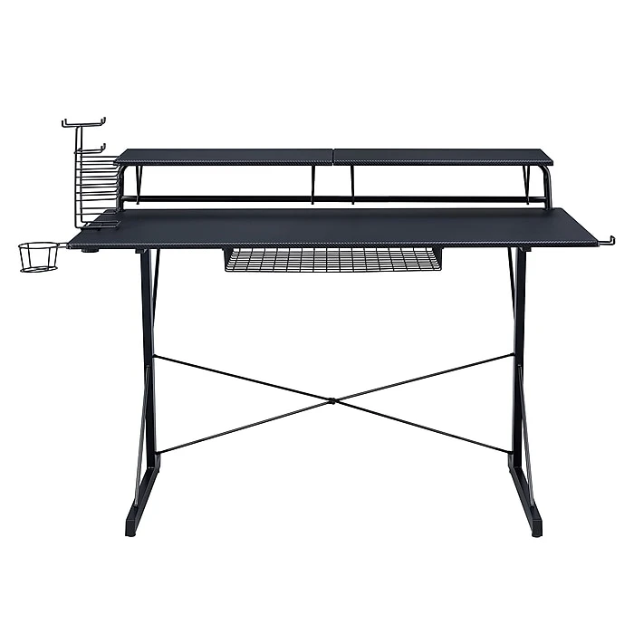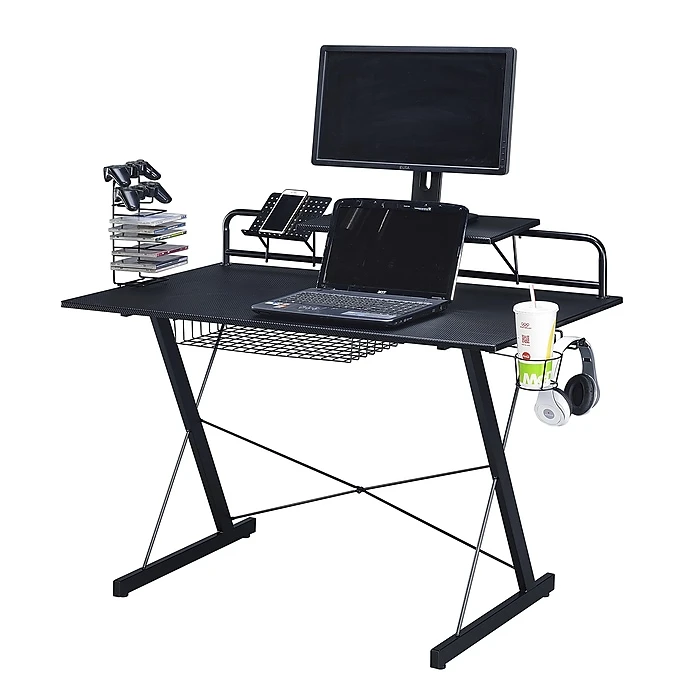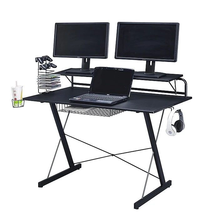 Here’s a desk that is specifically designed for all your gaming gear so you can focus on that epic battle at hand. Totally equipped for your geekery, this desk features built-in headphone holder and media storage rack. Donāt worry, there’s a cup holder for those long gaming sessions. It comes equipped with two elevated monitor stands to fit dual monitors. This desk is truly “Where comfort meets peak performance”. Ready and easy to assemble. 5 year warranty. Color: Black Carbon Fiber