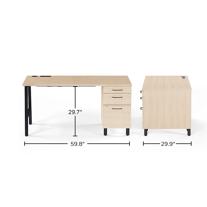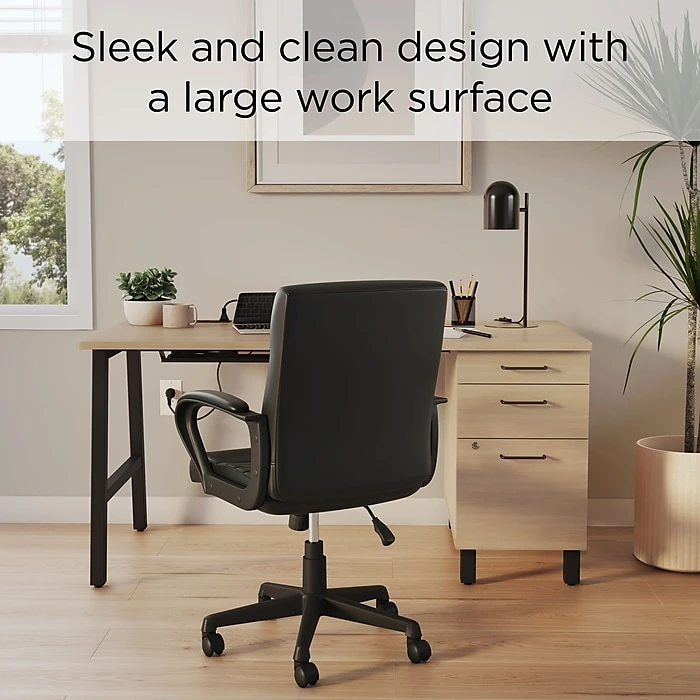 Store files and folders conveniently at work with this Union & Scale™ single-pedestal desk. The three drawers provide ample storage space for everyday office essentials, while the leveling glides enable stable positioning. Featuring locks, this desk secures important and sensitive office documents from unauthorized access, and the metal A-frame legs provide sturdy support. This Essentials natural single-pedestal desk boasts a cable management tray to keep wires neatly tucked and a laminate top to add a sophisticated style to your office furnishings.