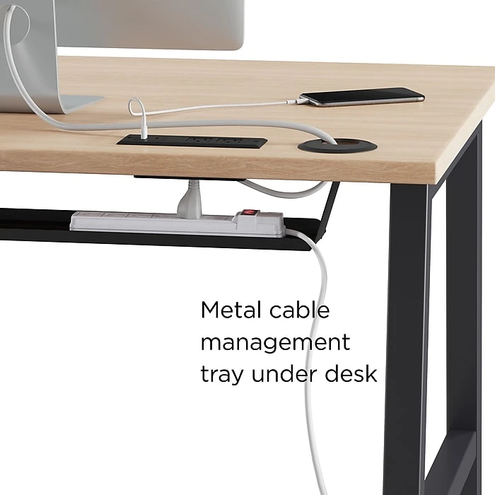 - Fabric-wrapped modesty panel and metal cable management tray under the top for easy cable organization